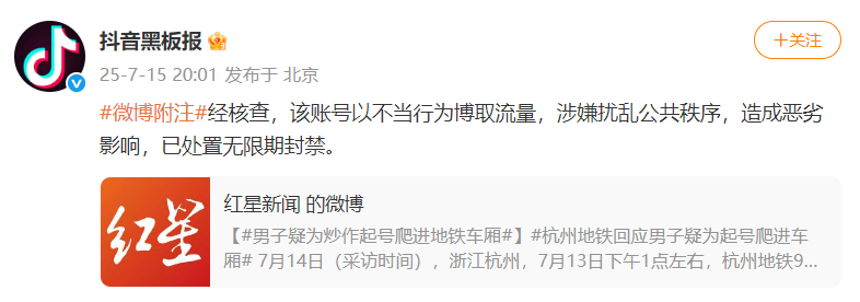 7月15日优股平台,@抖音黑板报 转发红星新闻该条动态并发文称:经核查,该账号以不当行为博取流量,涉嫌扰乱公共秩序,造成恶劣影响,已处置无限期封禁。